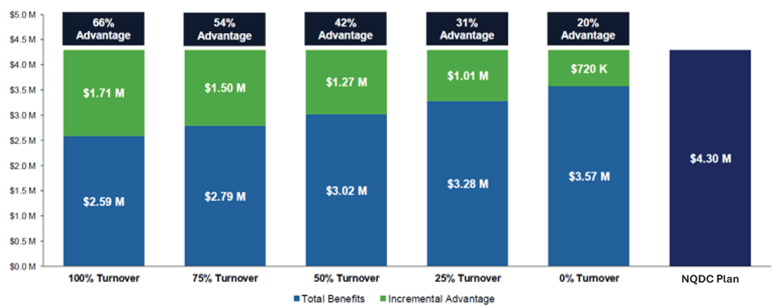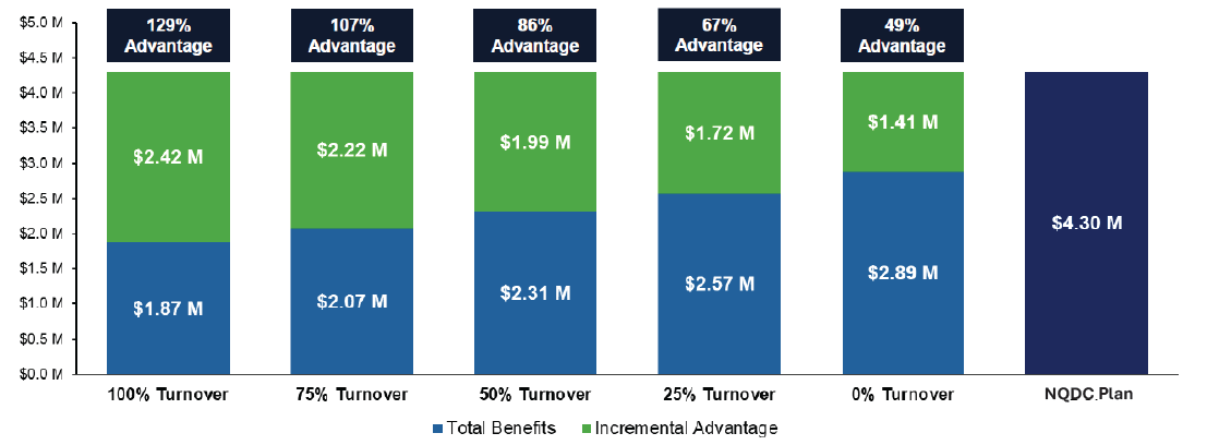 As turnover increases, the NQDC plan advantage accelerates dramatically